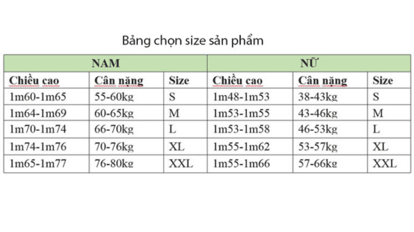 - XS (Extra Small): Thích hợp cho người có chiều cao dưới 160cm và cân nặng dưới 50kg.